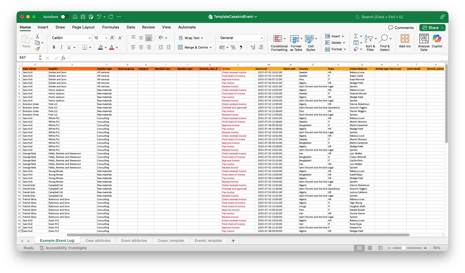 In dieser Beispieldatei finden Sie eine Template-Event-Logdatei, mit der Sie sofort mit Process Mining in ProcessMind starten können. Diese Logdatei enthält alle wichtigen Spalten, die für die Analyse mit Process Mining benötigt werden, sowie optionale Attribute für zusätzliche Insights. Wie Sie diese Logdatei in ProcessMind nutzen, erfahren Sie in unserer Dokumentation unter Upload Ihres ersten Datasets .